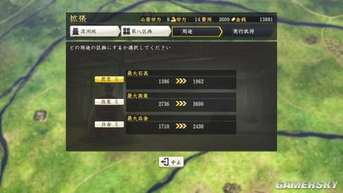 另外在內政選項中,還有一個所謂“擴張”的指令,這是可以讓玩家們來擴大城下町區域的指令,當玩家們的城鎮人口數增加到一定程度之後,就必須利用這個指令來擴大城下町的區域範圍,如此一來才能容納更多人口進入,而且由於區域擴張會對鄰接的區域產生影響,因此玩家們必須先慎重考慮,才能有效擴大城鎮來提升國力!
