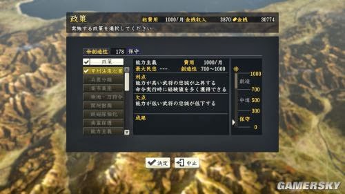 至於“政策”,這是設定每個大名家各自制度的指令,由於這個制度效果會對勢力領國全體造成影響,因此可說是非常強力的指令,不過要實施這個指令,必須要以該勢力的“創造性”作為指標才行,如果創造性與政策不符,將無法實施該政策指令。舉例來說,充滿創造性的織田家可以實施的政策指令包括“關所撤廢”(關所撤廃)等指令,不過卻無法實施“兵農分離”或“樂市樂座”等指令,而“創造性”會隨著大名與家臣思考方法“主義”,以及在寺或教會等文化設施存在而產生改變。附帶一提,政策中有些則是各大名家固有的內容,例如武田家的“甲州法度次第”,可以提高家臣忠誠的突繩提升騎馬的攻擊力。