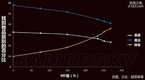 下面的列表展示出了6個數據點下所有白色裝備,魔法裝備和稀有裝備的出現概率。 這個圖表可以向大家說明MF對獲得物品的效果。