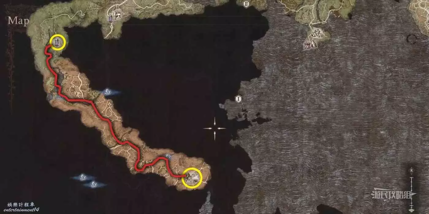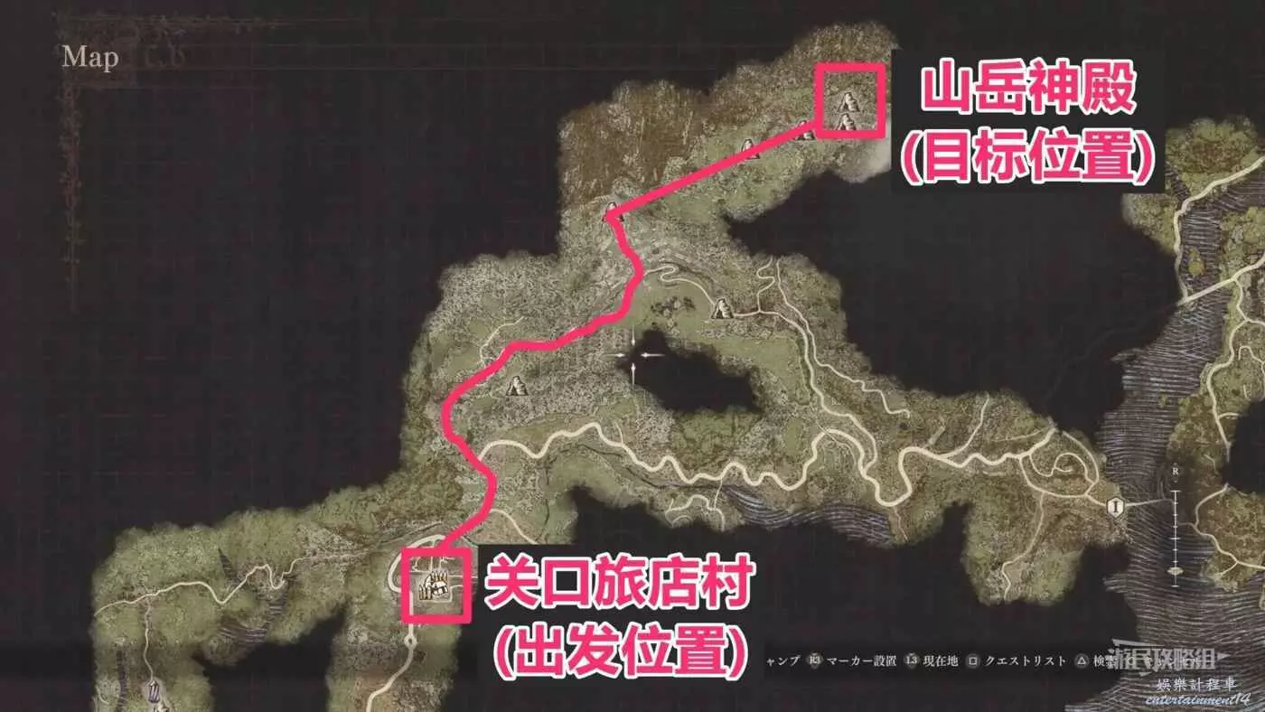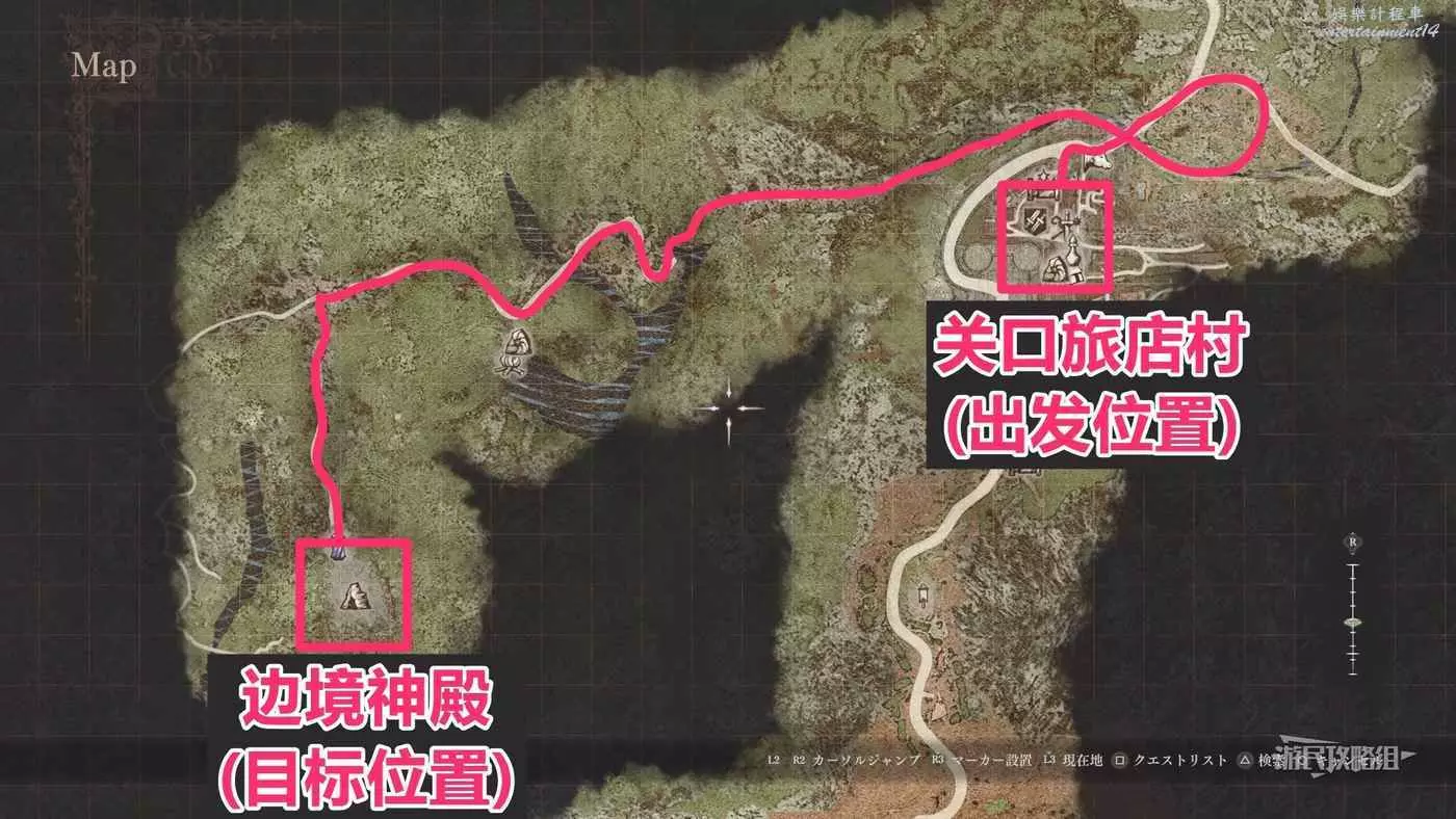 解答第一階段斯芬克斯的五個謎題後,斯芬克斯會飛走,然後出現在邊境神殿。與山嶽神殿一樣依然建議從關口旅店村出發,按照下圖所示路線前往。