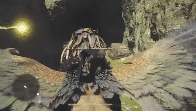 或者也可以騎在它背上直接一起飛過去。注意這裡一定要在它想要起飛時立即抓住它的脖頸和胸口位置(由於某些原因圖就不放了),然後迅速移動到它的背上,如果在飛行過程中一直抓著它的話體力無法支撐,因此在進入雷鳴洞穴前建議一直待在它背上,並且時不時鬆手恢復一下體力。