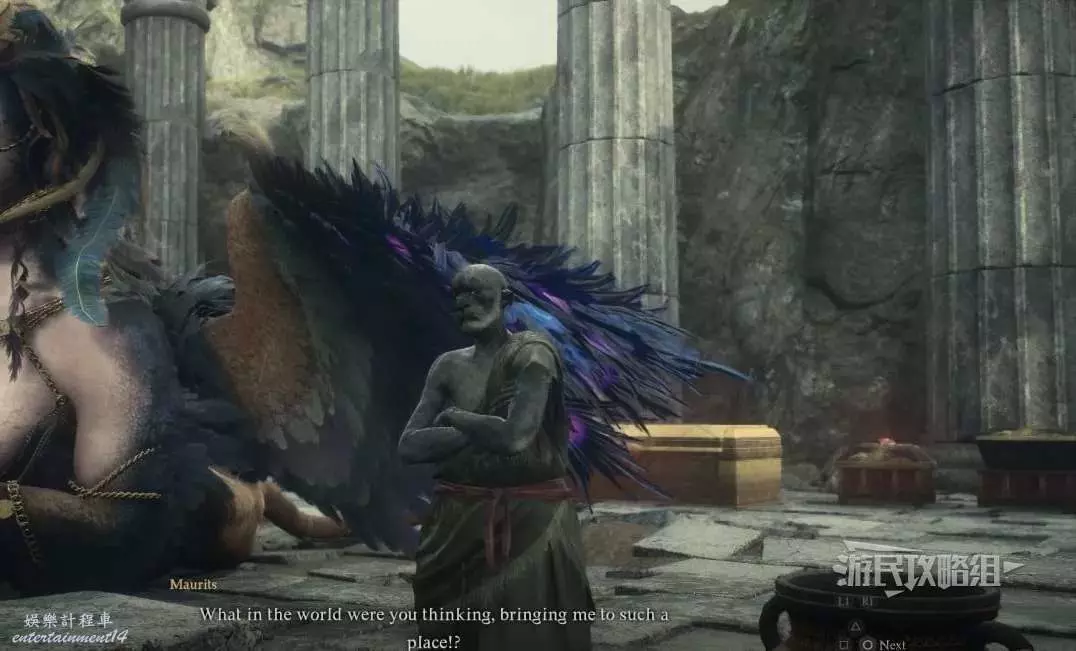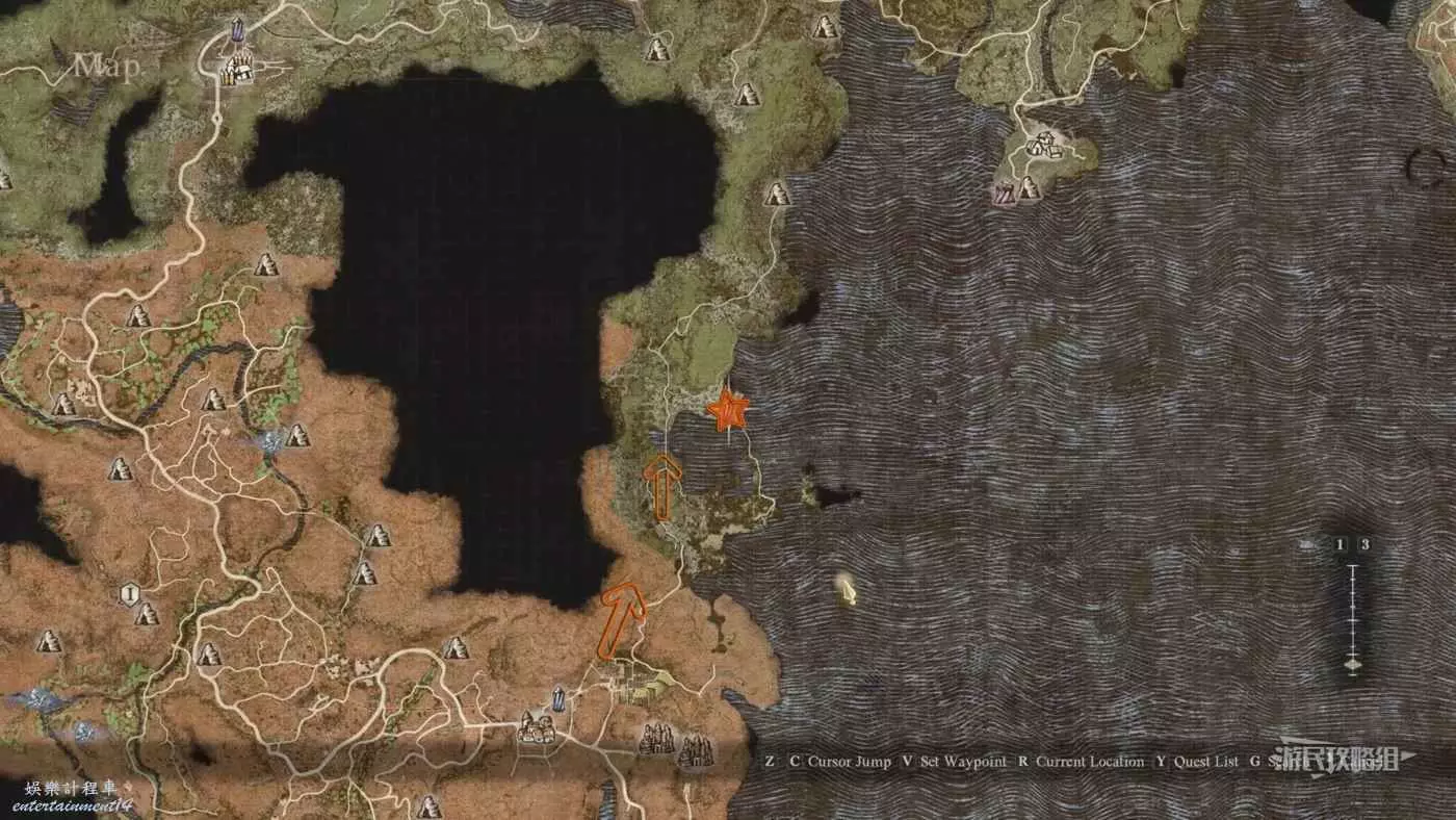 第一階段斯芬克斯會在地圖左上角的山嶽神殿出現,建議從關口旅店村出發(從維綸沃斯和巴克巴達爾乘坐牛車前往)按照下圖路線前往。