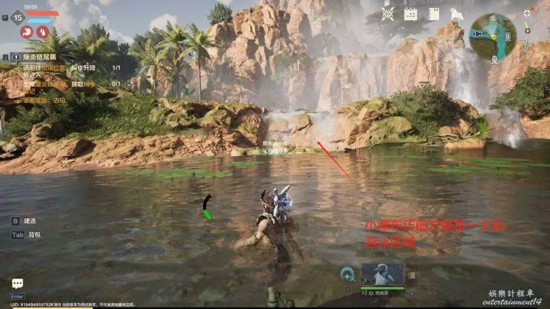 來到釣魚點進入水中逆水流往上走就有一個瀑布,瀑布整塊區域都是深水區,可供拓荒者們盡情遨遊