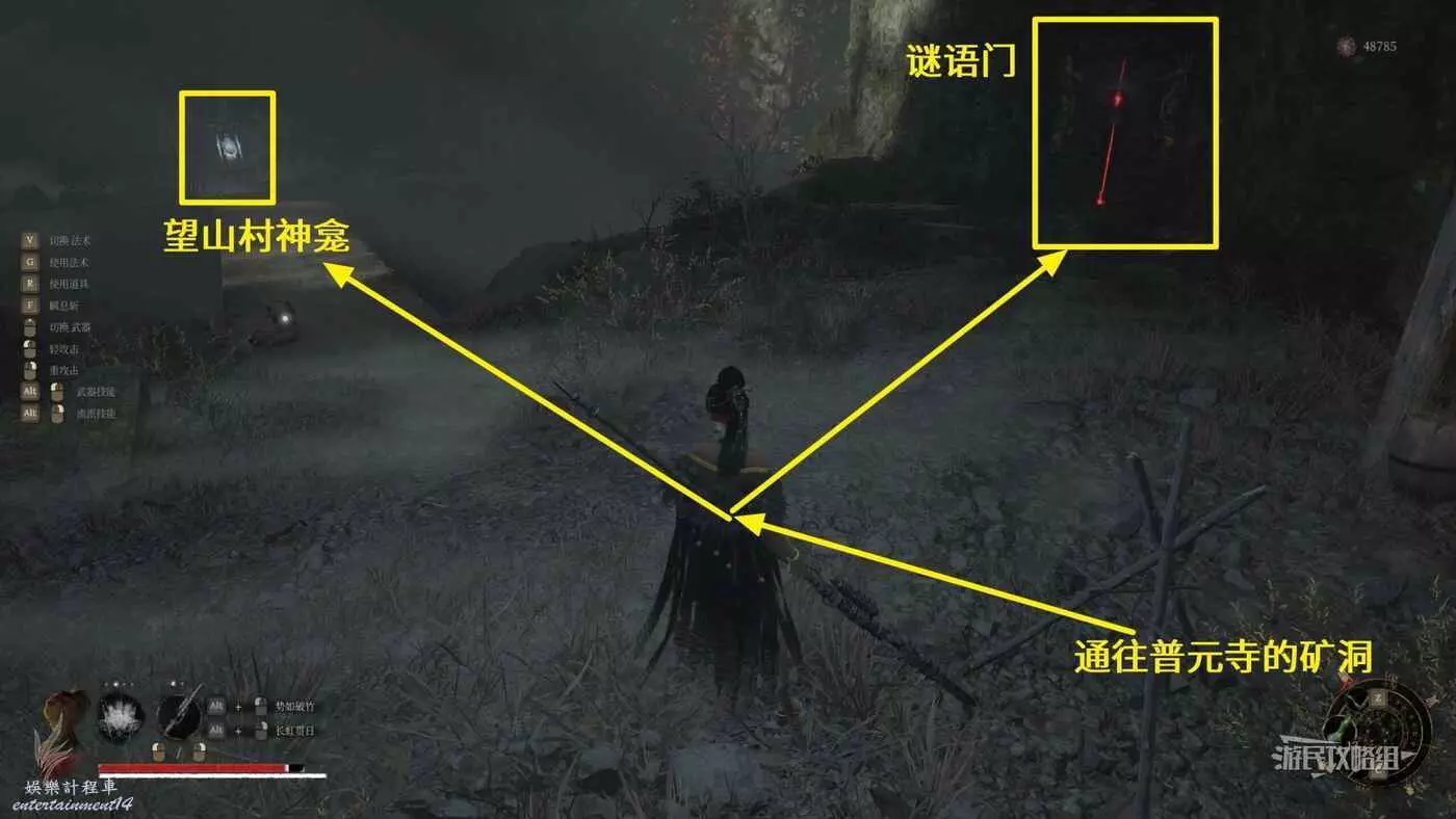 打完佛源鎮唐王行宮內的BOSS“指揮使”紅嵐後,自動返回普元寺,使用【普元寺鑰匙】打開普元寺院內廣場上的側門,沿著唯一的路穿過礦洞前往望山村,在礦洞出口往右看,可以看到一個紅色謎語門,橋對面是【雲頂城-望山村】的神龕。