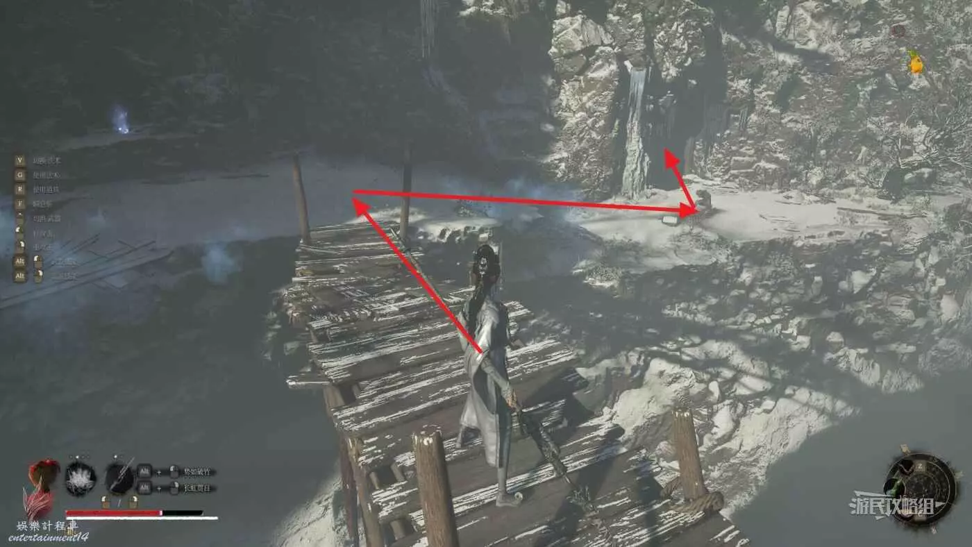 穿過木橋到達對面山上。注意木橋兩側沒有空氣牆,掉下去會即死,對面岩石後也有小怪。