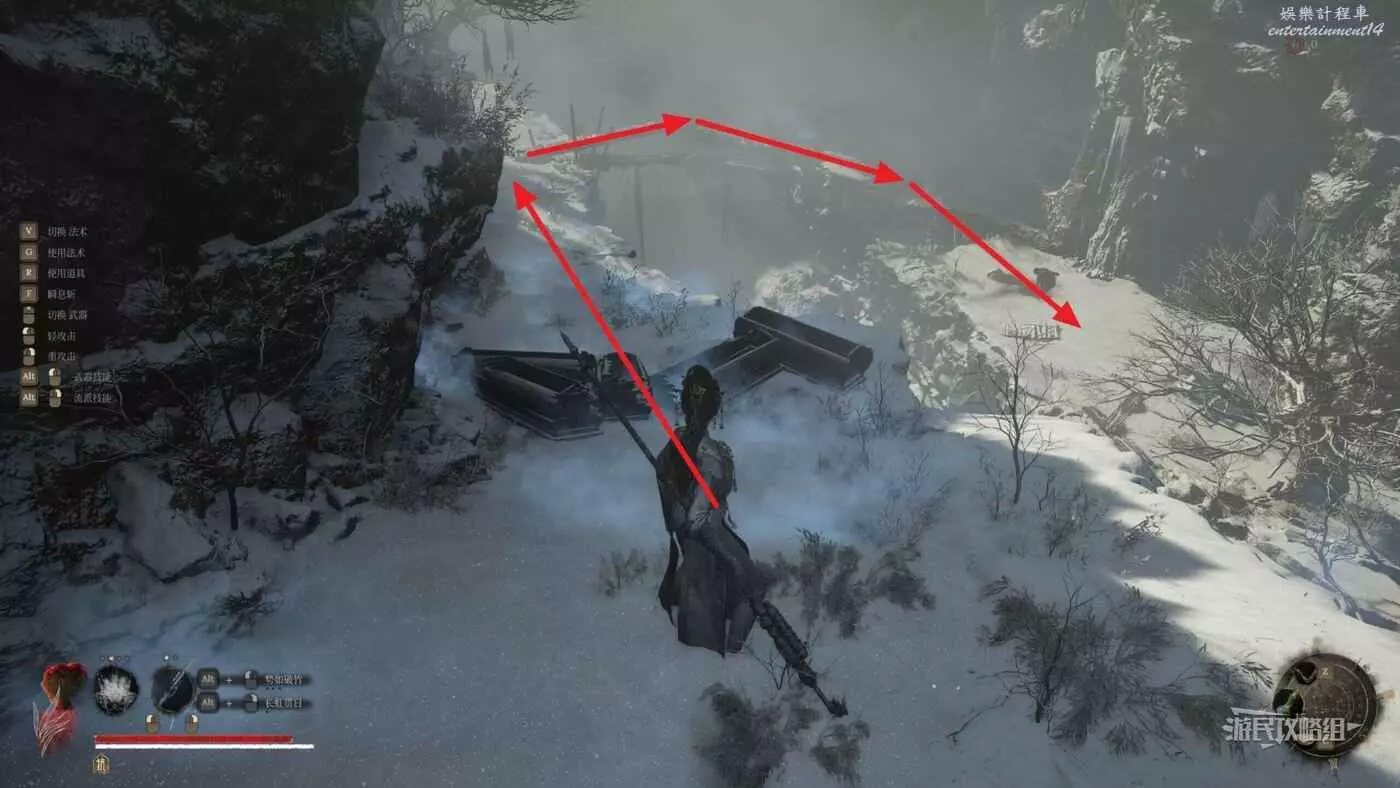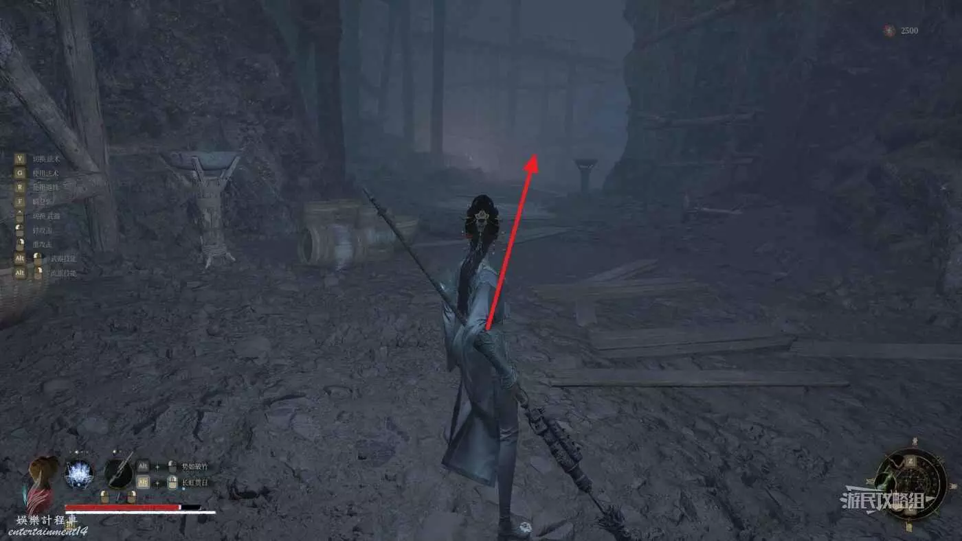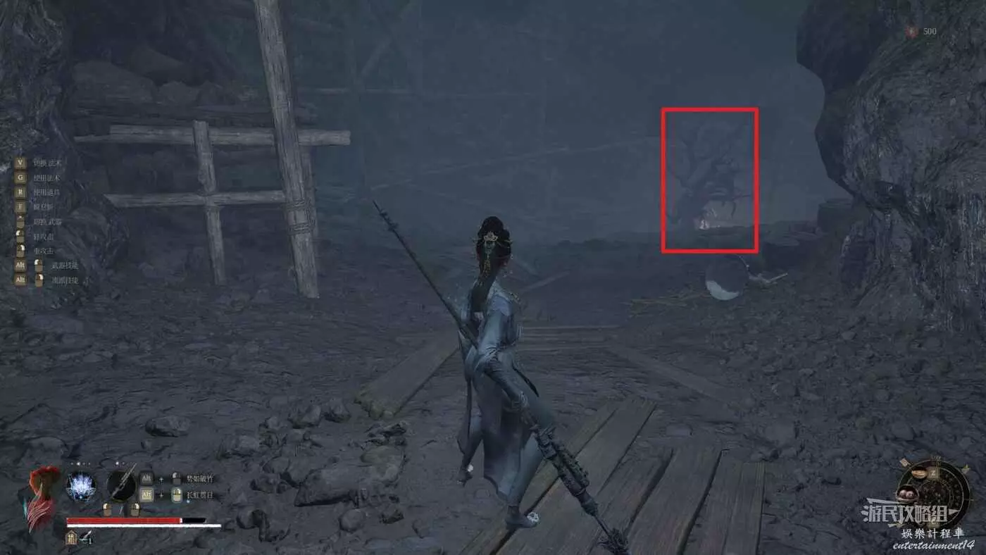 穿過第一道門後,往左看,左邊紅牆有個缺口,從缺口進入側面區域。