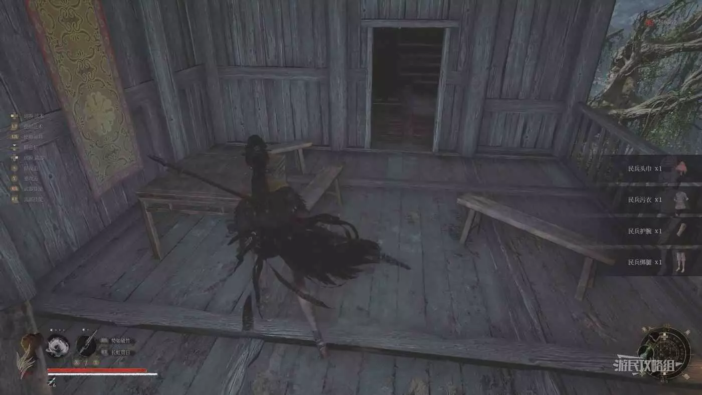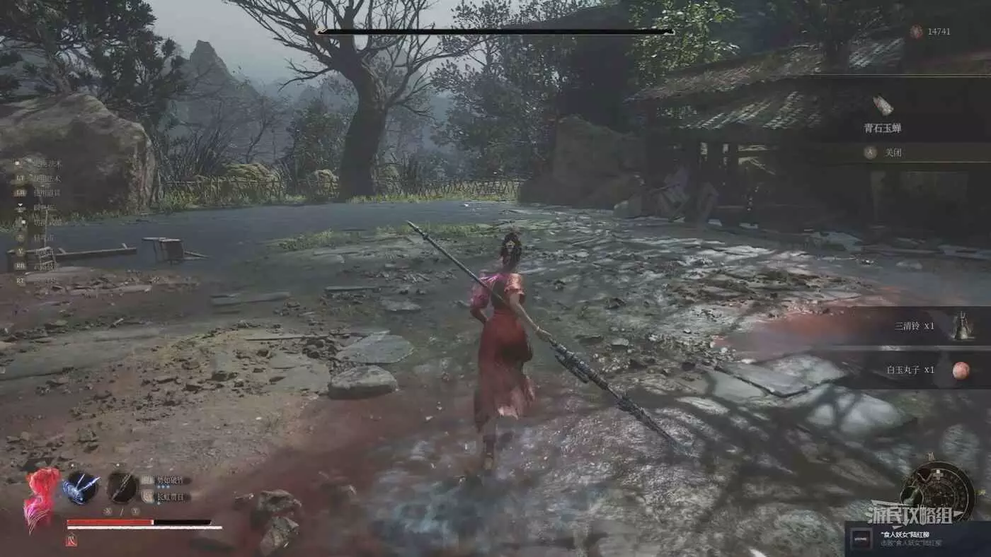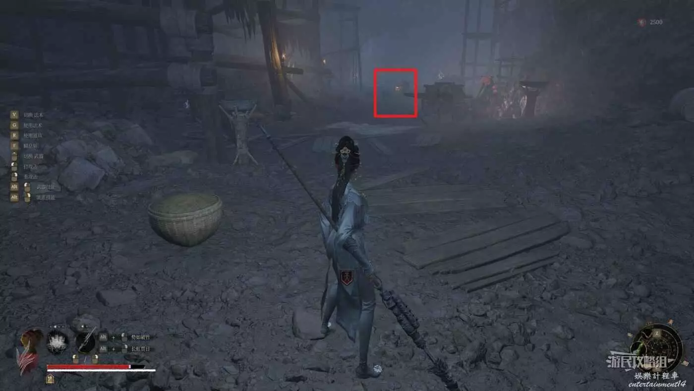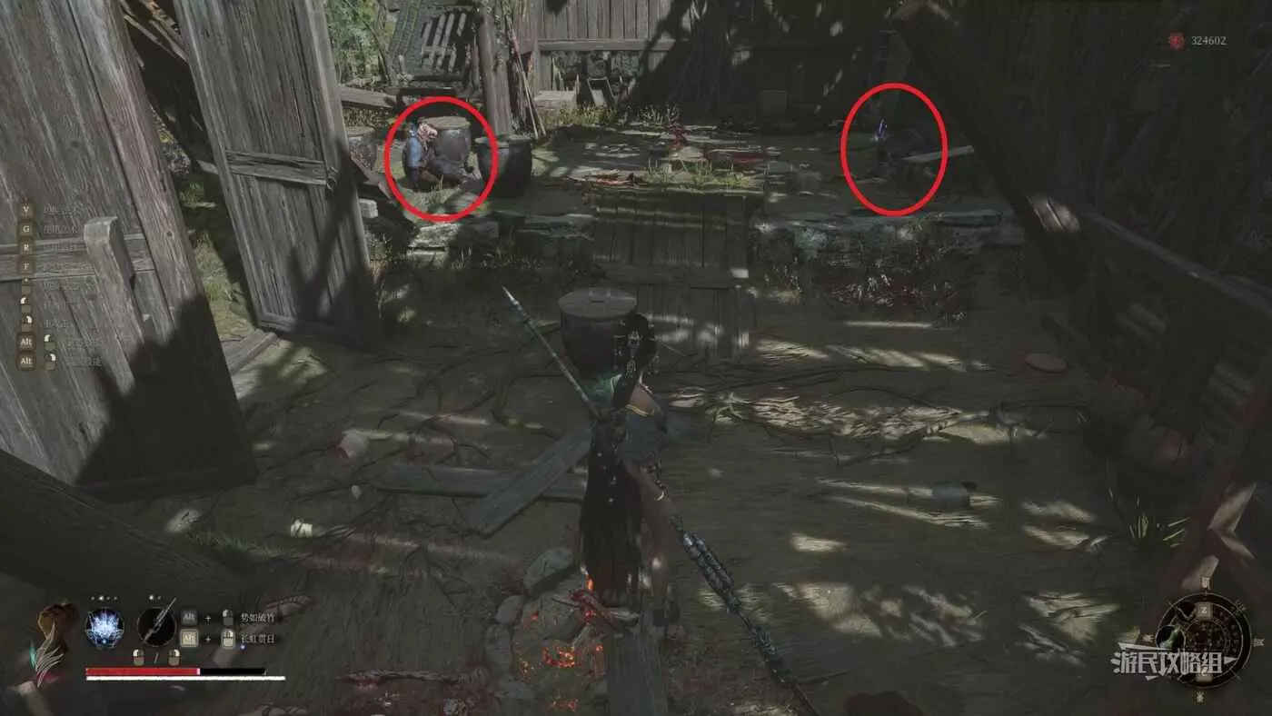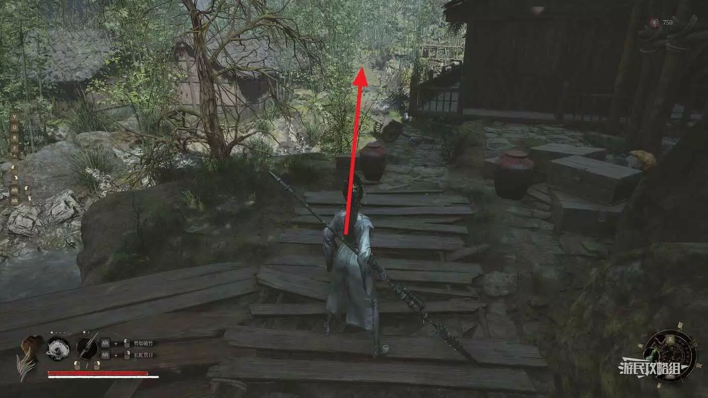 上台階繼續往前走,左邊房子進門就會觸發與唐王宮女的BOSS戰,右側現在是水池,需要排幹水池後往下跳才會最終觸發與BOSS紅嵐的戰鬥。這裡建議先不要進左側房門,先直著往前走,穿過整個BOSS房,注意前方有扔油瓶的小怪,不要被炸到。