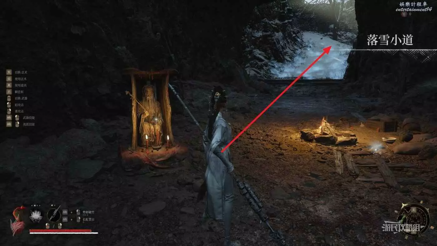 解鎖神龕之後就可以回去打唐王宮女了。從神龕往山頂上走是放水池的機關(機關鑰匙在另一條岔路上),另外幾條岔路也有可以探索的內容。
