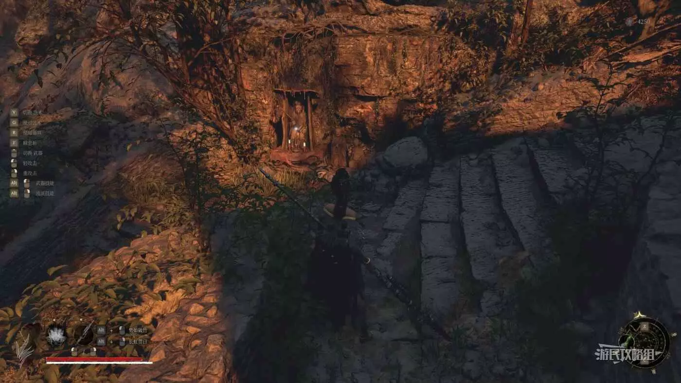 從【佛源鎮-含光禪院】神龕出發,使用禪院鑰匙(擊敗BOSS頭陀獲得)打開神龕正對面的門,沿路過獨木橋到達三步地,走到三步地的大樹下之後,走左側上樓梯。