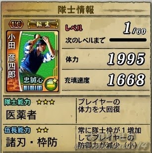 9.轉生:在隊士的等級達到上限後可以進行轉生,轉生需要消耗一把該隊士使用類型的武器。C,UC,R卡隊士轉生需要不同稀少度的武器,而SR特殊卡的幾位元則需要特定的武器,如品田需要姬鶴一文字,轉生後等級清空到1,而體力和充填速度繼續上升,隊士類型圖示變得酷炫,其他不變,看看品田變身後吧: