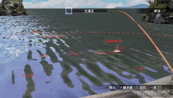 釣魚是如龍系列經典的一個小遊戲。本作中釣魚的難度降低,只要瞄著魚頭的地方丟過去,等魚上鉤,浮標下沉到紅色標示處就可以拉杆了。下麵是的魚分佈圖,紅圈內的魚會大範圍遊動: