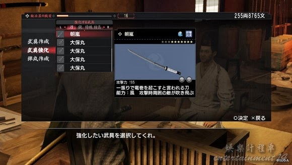 本次的武器強化系統中有經驗值這一項,上圖的左上方的“鍛冶屋の腕前”便是。等級越高,強化武器時越輕鬆,如下圖,齋藤一馬正像科比一樣打鐵,起始等級只有一個金,升級後金的數量增加。