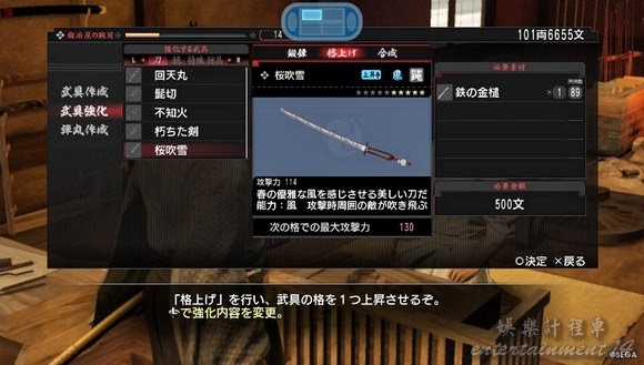 可以獲得差不多25000的德吧,去把”德的取得率“升級了,升一級以後各途徑獲得的德*1.1,最高級*1.5。早升級之後購買素材獲得的德更多。可是買了之後不能買了呀,怎麼辦?把買來的素材用掉,本作的武器系統中武器帶有”“屬性(可理解為”鋒利度“),需要上面購買的素材來打造。下圖作為例子,這把櫻吹雪的鋒利度為右上角顯示的”“,這個級別鍛煉武器用到的素材是”青綠色的金屬粉末“,可以不斷地鍛煉武器直到達到這個格的攻擊力上限,圖中顯示為115