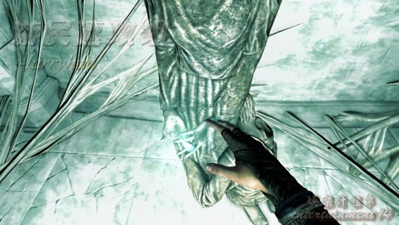 然後來到控制轉動器的地方.左邊的開關是空內置振動器的位置的,把它調到不穩定(震動激烈)的位置,然後利用右邊的開關把震動幅度調大一檔,把特定位置的玻璃給震碎,如此重複三次,先調整震動帶位置,再調整震動幅度,便可把裝置完全震碎,然後進去拿到寶石.在裝置右邊的樓梯過去,如果有繩索箭的話,可以下去下面獲得收藏品一個.