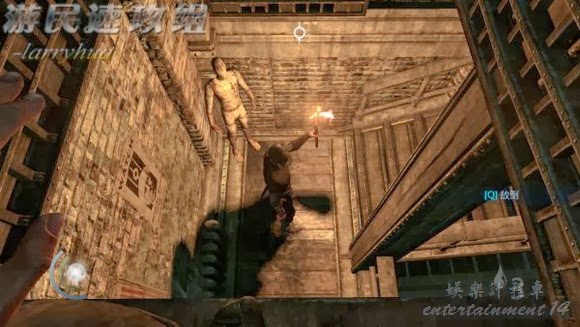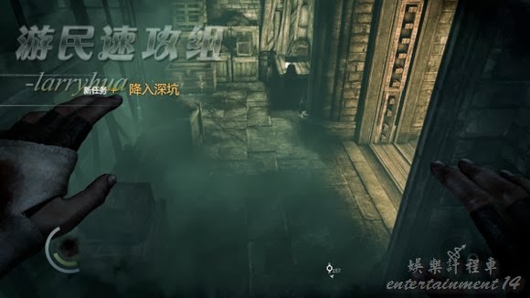 到了上層穿過隧道之後來到地下墓穴.發現需要不明生物在遊走, 從上圖左邊出去然後爬下去到對面, 然後趁怪物走下臺階的時候去把門搖下來通過.