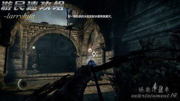 按著指示越過水道之後從箱子裡找到水箭,按6裝備並使用在旁邊的火把上為我們提供一條隱蔽的道路.通過陰暗的道路找到小夥伴配合她按Q從背後放到一位守衛.