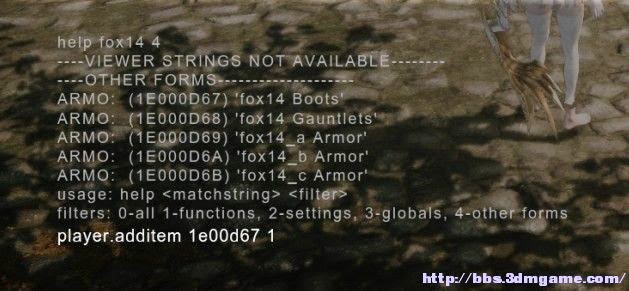 再輸入player.additem 裝備代碼 1就可以得到想要的裝備了如圖