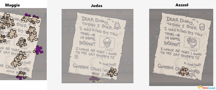 功能:擊殺敵人時有概率掉落半個紅心。帶著此飾品在獻祭房死於獻祭,死亡介面上的兇手欄將會顯示一片拼圖碎片。