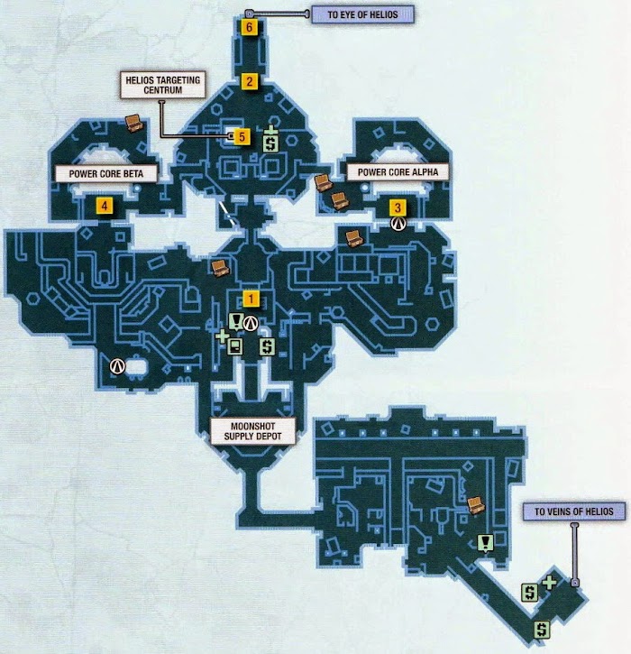 現在我們再次傳送去Lunar Launching Station(月球發射站),在東南方的懸賞榜上接“Lock and Load”(瞄準上膛)任務並完成之,然後進入Veins of Helios(赫利俄斯山脈)場景,啟動“Don’t Get Cocky”(不要搞砸了!)任務並完成之,然後切換成“Eradicate”(滅絕!)(特殊!下圖示!)任務。從這個平臺起,按照下面幾張圖的順序拾獲機械部件。
