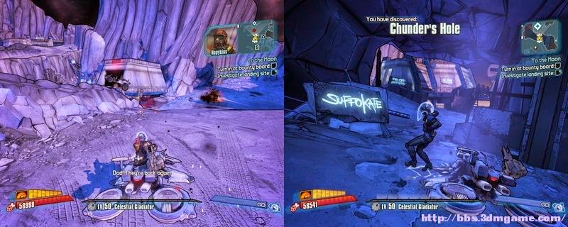 退出後重進,現在我們去Lunar Launching Station(月球發射站)。到達後先在懸賞榜接任務“Things That Go Boom”(會爆炸的東西)(注意!這個任務接後一定得完成後再退出,否則算失敗!)以及“Red,Then Dead”(紅色,接著就得死!)(特殊!)(注意如果要刷這個任務的裝備“The Shooting Star”絞肉盾–類似於2代的愛之巨人的話,最好還是暫時不要接這個任務!)兩個任務。先做第一個任務,在場景北區中部啟動第一個機器人前可以順便接“Picking Up The Pieces”這個任務,然後護衛機器人去下載程式的地點剛好就是“Red,Then Dead”(紅色,接著就得死!)(特殊!)任務中第一個Courier(信使)所在的地方,順便搞定他!注意在這期間請不要離開“Things That Go Boom”(會爆炸的東西)任務下載中的機器人太遠,否則算任務失敗!