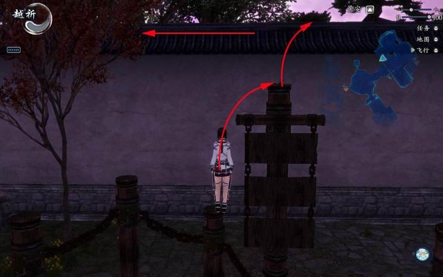 筆者找到一條路線是跑到如圖的練武場,這裡有很多的木樁,可用來跳上圍牆。