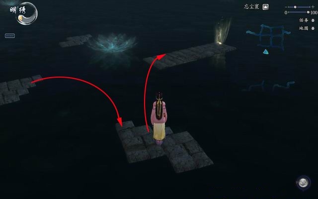 這裡要熟悉一下“淩波微步”技巧,就是往前跳到水中立刻起跳,也就是踩一腳水再跳,不但可以不沉,還可以跳躍更遠一些的距離。