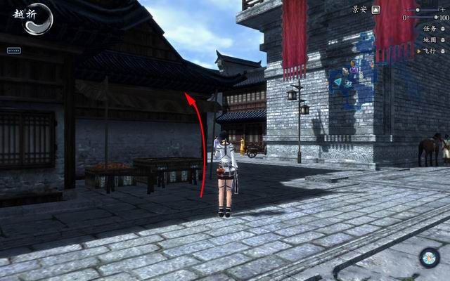 轉到城門樓的另一側,找到這個有雨篷的攤位,跳上雨篷再跳上屋簷上。