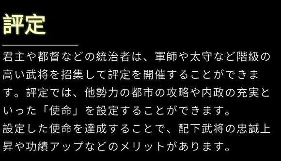 統治者の立場では、配下武將の提案の中から、勢力の狀況や賛成數などを鑑みて、採用する使命を決定する。