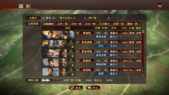 在部隊編輯介面上,可以選擇主將、副將、兵種、和是否攜帶兵器。兵種大體分為騎兵、槍兵、弓兵。部隊編輯最好參考武將擅長兵種和敵軍兵種。