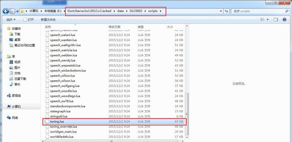 打開遊戲根目錄,進入【Dont.Starve.Incl.2DLCs.Cracked\data\DLC0002\scripts】資料夾,找到名字為【tuning.lua】的文件。