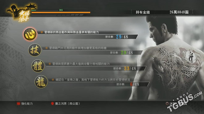可強化的能力一共分“心”、“技”、“體”、“龍”四大類。“心”即與熱血量表和熱血動作相關的能力;“技”是戰鬥中可使用的招式、閃避動作等等;“體”則強化生命值、攻擊力、防禦力等基本數值;最後一項“龍”是用來強化終極戰鬥風格“堂島之龍”的,該專案無法自主加點,需要在新系統“真島趴趴走”中與真島吾朗多次對決、提升彼此的“孽緣值”來領悟。