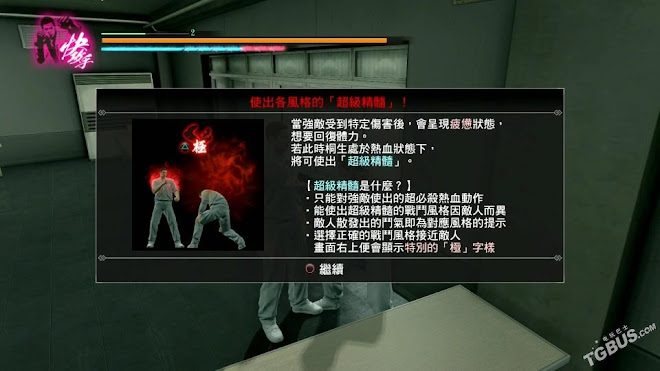 作為熱血動作削弱的補償,遊戲為BOSS戰設計了新系統“超級精髓”。遊戲中每種風格都有一種獨有的“超級精髓”,需要在強化能力介面學習。BOSS體力削減到一定程度會陷入“疲勞”狀態,此時BOSS無法行動,全身冒出鬥氣,但生命值會快速恢復。保持熱血狀態,切換到與BOSS鬥氣顏色相同的風格靠近他(比如BOSS放出藍色鬥氣我們就用“流氓”,金色鬥氣就用“火爆浪子”),畫面右上角就會出現“極”字樣,此時按△即可對BOSS造成大量傷害。如果BOSS已經陷入疲勞但我方熱血量表不足,可以先切換到“快攻手”風格,兩套連續拳即可蓄滿一條。