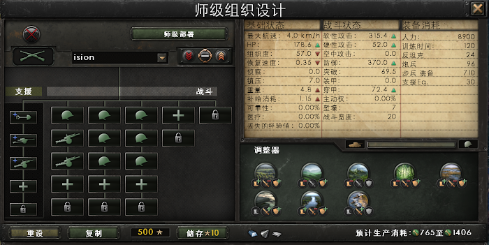 我作了一些調整:1.裝甲營改為40寬度,這方便戰場上調度,在戰線裡抓住一兩個裝甲營,對著陣型薄弱處懟就行了,不必怕裝甲師抓得太少,不夠懟。2.取消坦殲,只用自走炮,以方便撕開戰線。