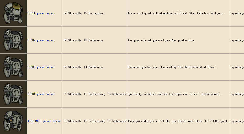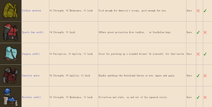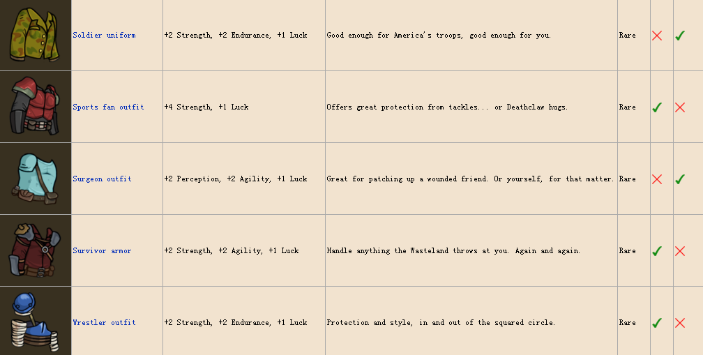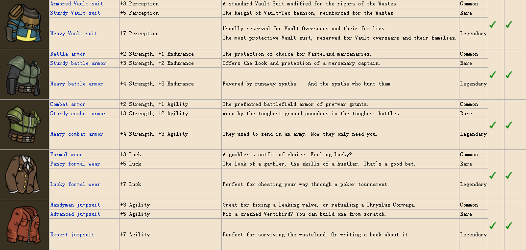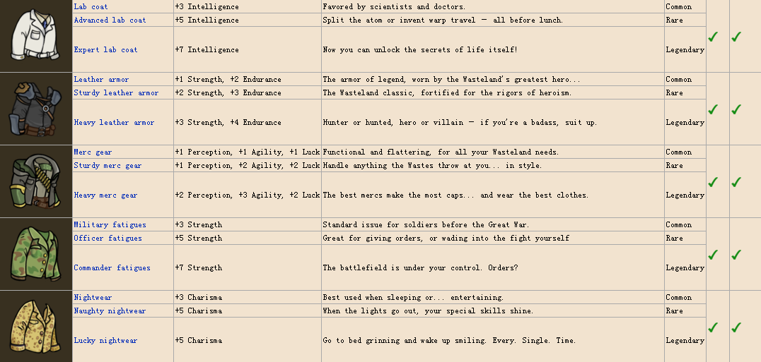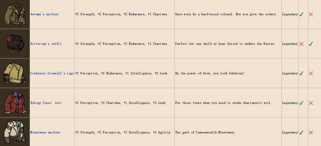 裝備~因為圖比較多,簡單說一下,common普通品質,rare稀有,lengendary傳說,第一個勾代表男性可用,叉表示不可用,後面女性同理