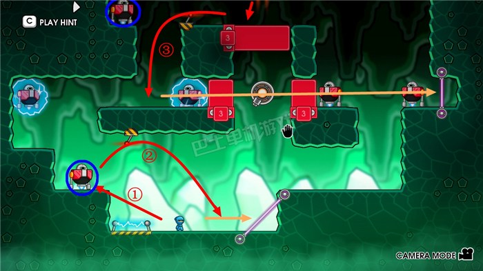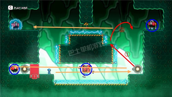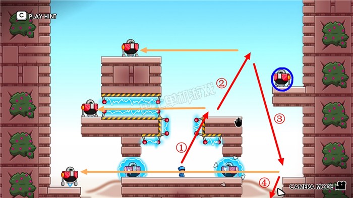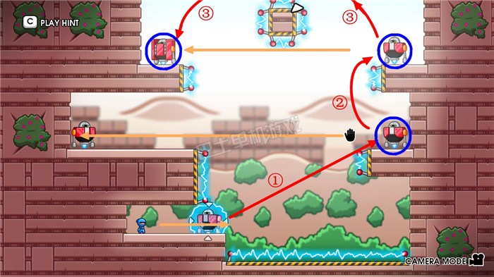 ①跳上左邊平臺,近戰破壞掉上面的機器人;