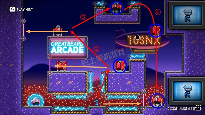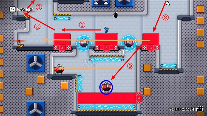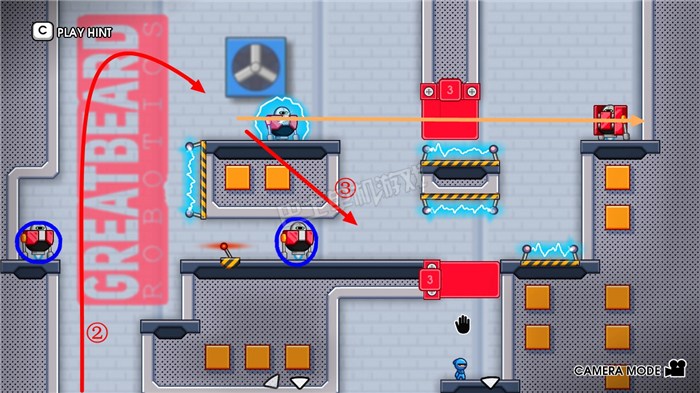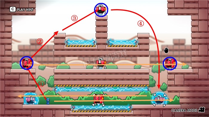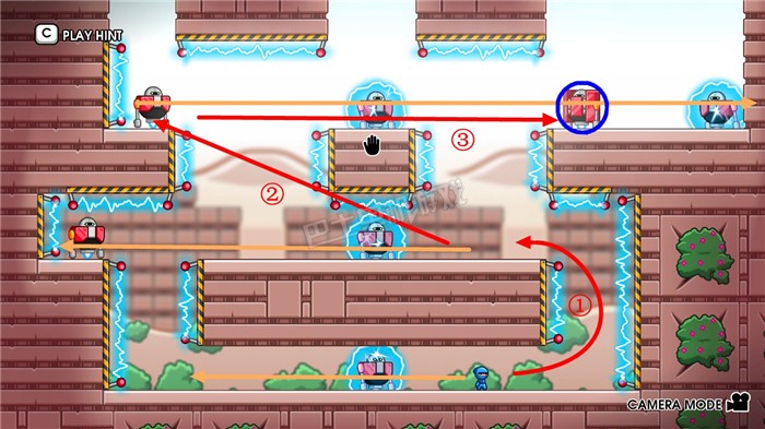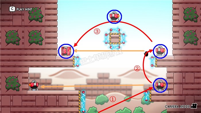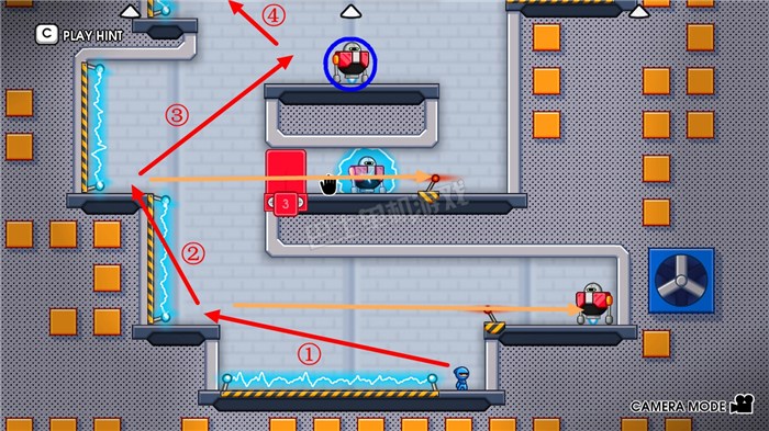 ③跳上右上角的平臺,近戰摧毀平臺上的機器人,然後對左上方的機器人扔兩發手裡劍;