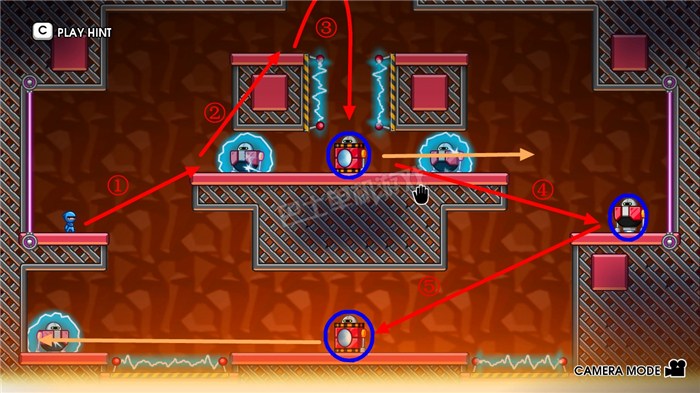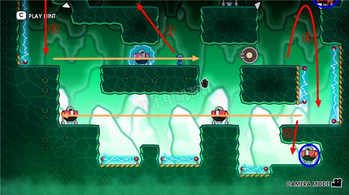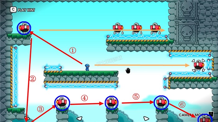 ⑤跳到最右邊的平臺上,對最後一個機器人補刀。