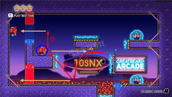 注:在下面的圖片攻略中,紅色箭頭代表行動路線,黃色箭頭代表手裡劍的飛行軌跡,藍色圓圈框出來的是被近戰摧毀的機器人。