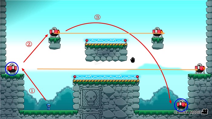 ③向空中跳,在最高處近戰摧毀左邊的機器人,落地後向右扔出兩發手裡劍;