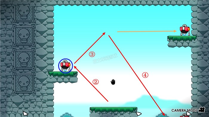 ①跳到左邊的平臺,近戰打掉右邊的機器人;