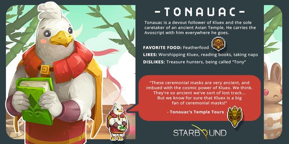 圖片翻譯:他是克魯西斯虔誠的追隨者,也是一座古代翼族神廟唯一的看守。他總是隨身攜帶著一本Avos 阿沃斯(翼族母星)語字典