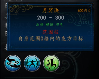 面板傷害:550-600。狀態:辟邪,神行。消耗內力1500,範圍技,自身範圍1格內的敵方目標。