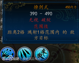 面板傷害:390-490.狀態:無視,破綻。消耗內力450,範圍技,距離2格 濺射1格範圍內 的敵方目標。