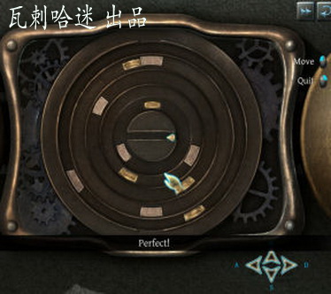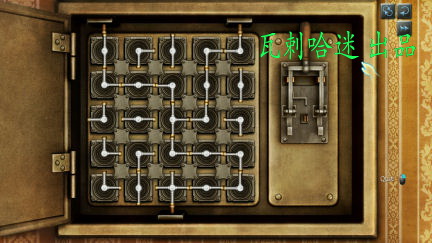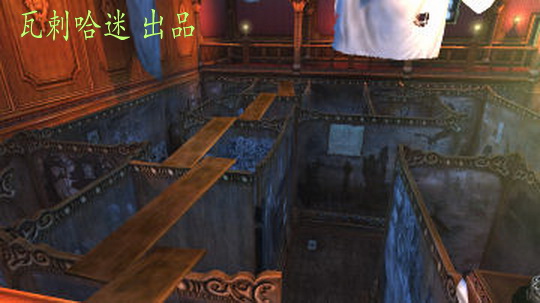 第一面牆:前進查看左邊純木牆。向右看看到一金屬輪面板,用它可以轉動純木牆。福爾摩斯說它生銹了,會發出聲響。