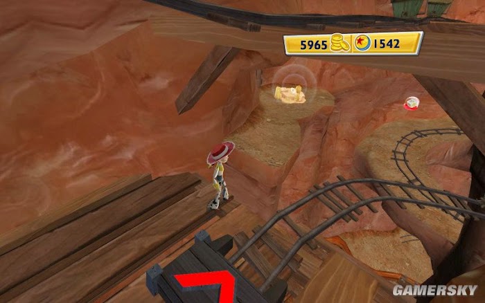 跳上鐵軌之後,沿路會有不少礦車阻擋你的前進;可以按SPACE+滑鼠左鍵跳躍過去。不過被碰到也沒有什麼,只是減少你的金錢數字