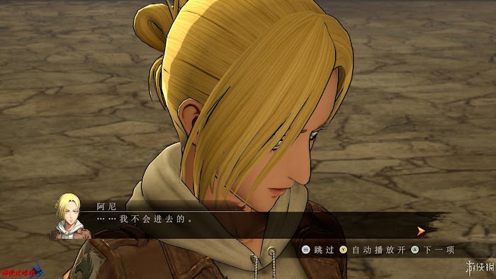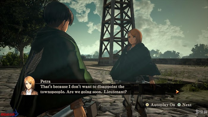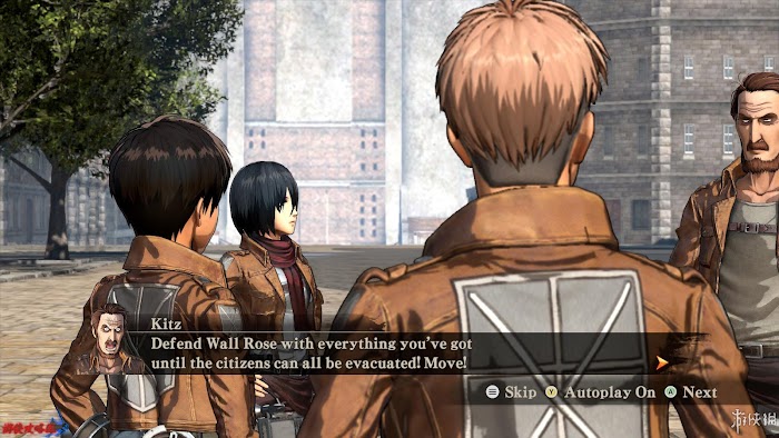 劇情:三笠很擔心艾倫,但是又告訴自己應該將注意力集中在自己的任務上,開始控制三笠,在營地中和[Ian|伊恩]對話,得知其他的後援士兵正在進行艱難的戰鬥,當前的任務是保護居民遠離巨人。