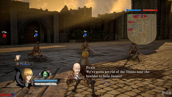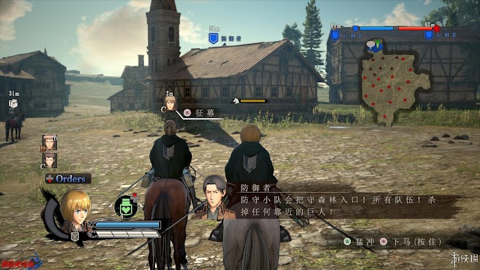 任務2:和艾爾文的隊伍一起突破前城區。艾爾文被巨人擋住去路時會停下或改變路線,其實本質還是需要消滅其線路上的巨人。