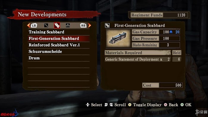 [劍鞘/儲氣罐]屬性:[Gas Capacity|氣體容量]、[Gas Pressure|氣體壓力]、[Blades Remain|劍刃儲備量],其中[氣體壓力]影響使用氣體移動時的速度。升級會增強除[劍刃儲備量]之外的兩項屬性。