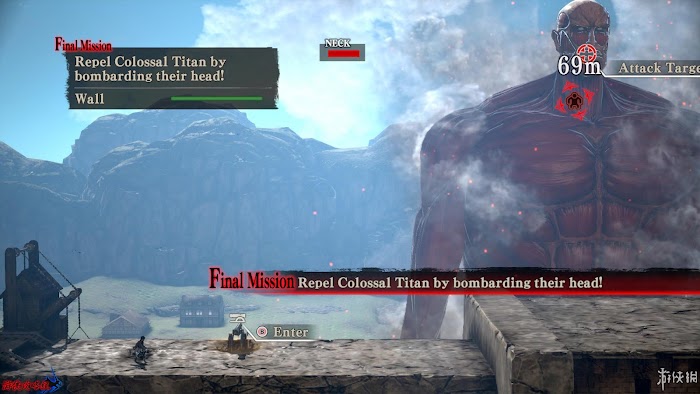 最終任務:使用加農炮命中超大型巨人[頭部],擊退它。通過左右搖杆控制方向,攻擊鍵發射炮彈,左側顯示的為該處加農炮的彈藥數量,數量為0時無法使用,不適用加農炮一段時間彈藥量會緩慢恢復。每發加農炮之間需要一定的裝彈時間,發射線路為抛物線。