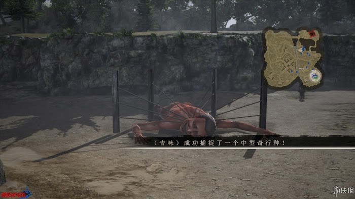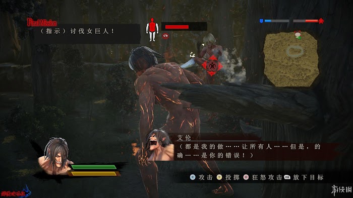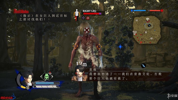 任務1:討伐女巨人並防止她逃走。這裡可以直接強行先攻擊女巨人四肢令其暴露後頸也可以通過將其引至地圖上綠色旗幟處啟動該處陷阱攻擊她。